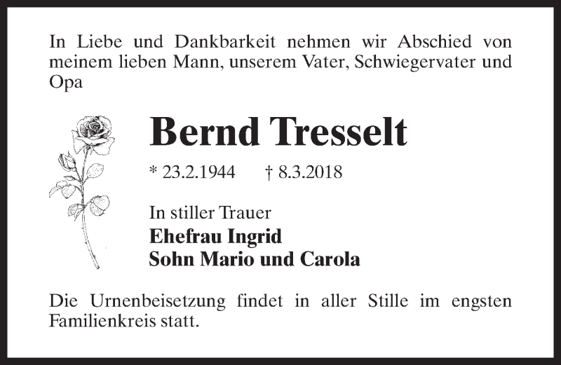 Hier finden Sie alle Traueranzeigen aus der Zeitung, die bisher für Bernd Tresselt erschienen sind. Weitere Traueranzeigen, die in der Zeitung erscheinen, werden hier ebenfalls aufgelistet