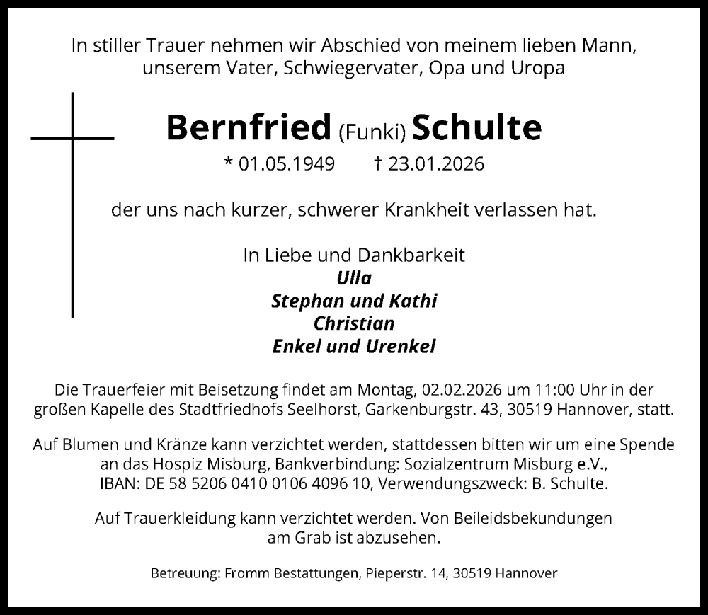 Hier finden Sie alle Traueranzeigen aus der Zeitung, die bisher für Bernfried Schulte erschienen sind. Weitere Traueranzeigen, die in der Zeitung erscheinen, werden hier ebenfalls aufgelistet