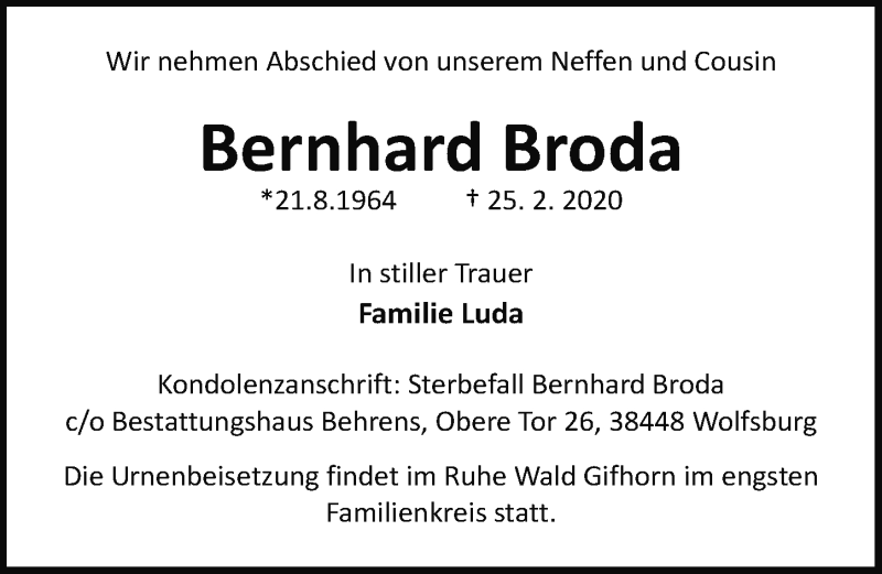 Hier finden Sie alle Traueranzeigen aus der Zeitung, die bisher für Bernhard Broda erschienen sind. Weitere Traueranzeigen, die in der Zeitung erscheinen, werden hier ebenfalls aufgelistet
