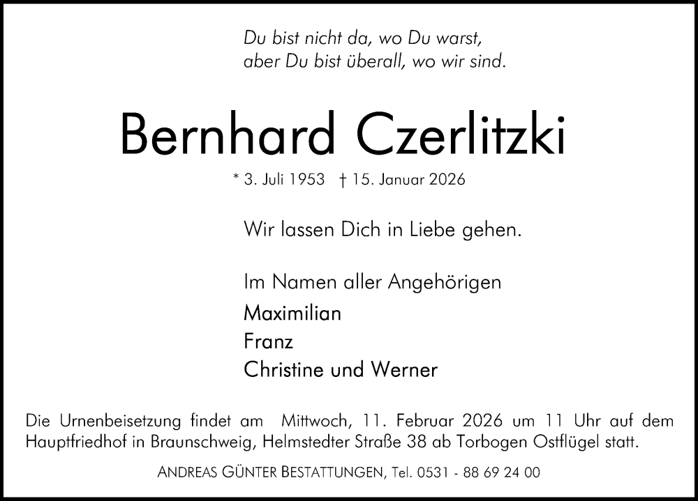 Hier finden Sie alle Traueranzeigen aus der Zeitung, die bisher für Bernhard Czerlitzki erschienen sind. Weitere Traueranzeigen, die in der Zeitung erscheinen, werden hier ebenfalls aufgelistet