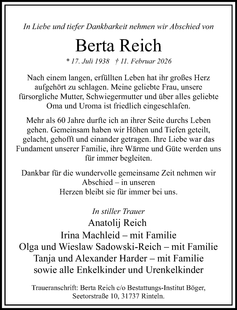 Hier finden Sie alle Traueranzeigen aus der Zeitung, die bisher für Berta Reich erschienen sind. Weitere Traueranzeigen, die in der Zeitung erscheinen, werden hier ebenfalls aufgelistet