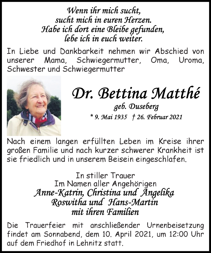 Hier finden Sie alle Traueranzeigen aus der Zeitung, die bisher für Bettina Matthe erschienen sind. Weitere Traueranzeigen, die in der Zeitung erscheinen, werden hier ebenfalls aufgelistet