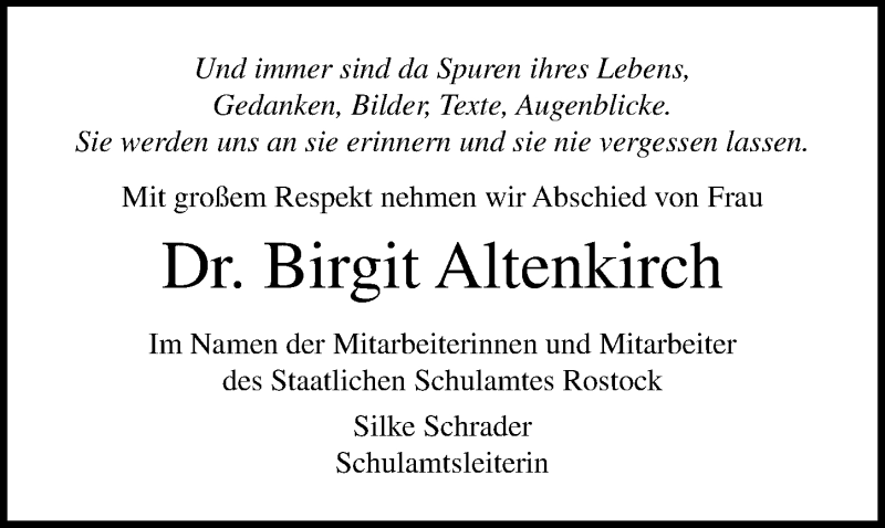 Hier finden Sie alle Traueranzeigen aus der Zeitung, die bisher für Birgit Altenkirch erschienen sind. Weitere Traueranzeigen, die in der Zeitung erscheinen, werden hier ebenfalls aufgelistet