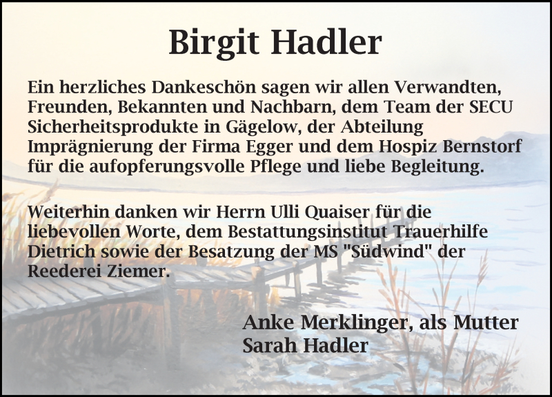 Hier finden Sie alle Traueranzeigen aus der Zeitung, die bisher für Birgit Hadler erschienen sind. Weitere Traueranzeigen, die in der Zeitung erscheinen, werden hier ebenfalls aufgelistet