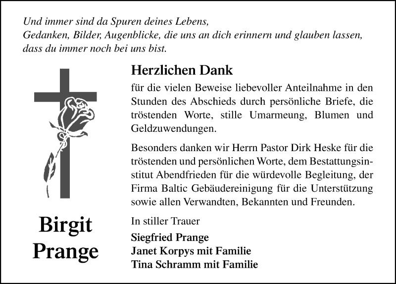 Hier finden Sie alle Traueranzeigen aus der Zeitung, die bisher für Birgit Prange erschienen sind. Weitere Traueranzeigen, die in der Zeitung erscheinen, werden hier ebenfalls aufgelistet
