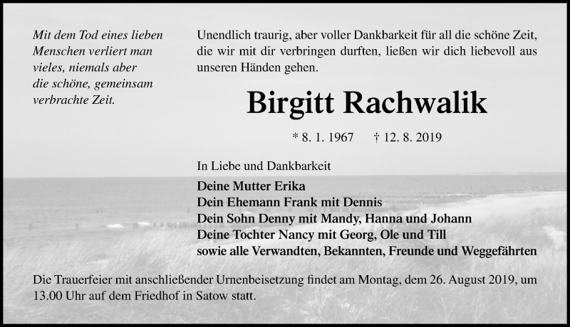 Hier finden Sie alle Traueranzeigen aus der Zeitung, die bisher für Birgitt Rachwalik erschienen sind. Weitere Traueranzeigen, die in der Zeitung erscheinen, werden hier ebenfalls aufgelistet