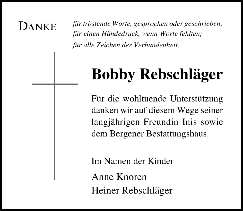 Hier finden Sie alle Traueranzeigen aus der Zeitung, die bisher für Bobby Rebschläger erschienen sind. Weitere Traueranzeigen, die in der Zeitung erscheinen, werden hier ebenfalls aufgelistet
