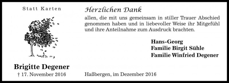 Hier finden Sie alle Traueranzeigen aus der Zeitung, die bisher für Brigitte Degener erschienen sind. Weitere Traueranzeigen, die in der Zeitung erscheinen, werden hier ebenfalls aufgelistet