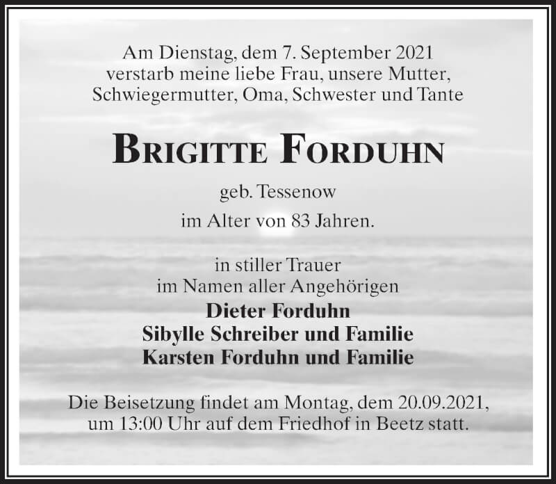 Hier finden Sie alle Traueranzeigen aus der Zeitung, die bisher für Brigitte Forduhn erschienen sind. Weitere Traueranzeigen, die in der Zeitung erscheinen, werden hier ebenfalls aufgelistet