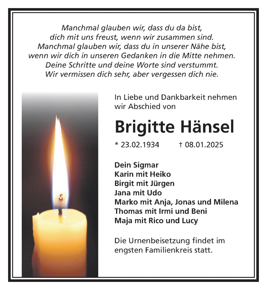 Hier finden Sie alle Traueranzeigen aus der Zeitung, die bisher für Brigitte Hänsel erschienen sind. Weitere Traueranzeigen, die in der Zeitung erscheinen, werden hier ebenfalls aufgelistet