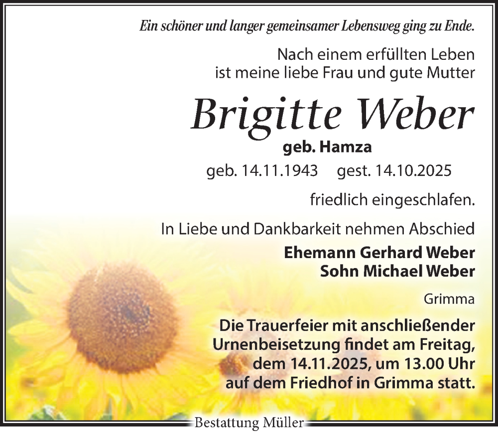Hier finden Sie alle Traueranzeigen aus der Zeitung, die bisher für Brigitte Weber erschienen sind. Weitere Traueranzeigen, die in der Zeitung erscheinen, werden hier ebenfalls aufgelistet