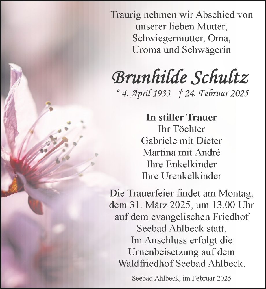 Hier finden Sie alle Traueranzeigen aus der Zeitung, die bisher für Brunhilde Schultz erschienen sind. Weitere Traueranzeigen, die in der Zeitung erscheinen, werden hier ebenfalls aufgelistet