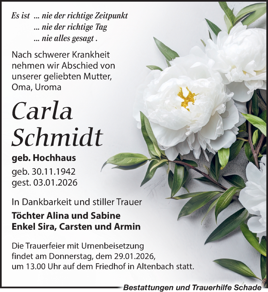 Hier finden Sie alle Traueranzeigen aus der Zeitung, die bisher für Carla Schmidt erschienen sind. Weitere Traueranzeigen, die in der Zeitung erscheinen, werden hier ebenfalls aufgelistet