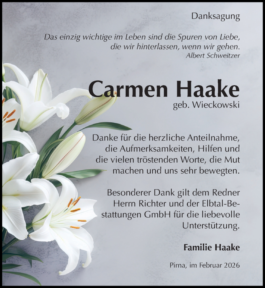 Hier finden Sie alle Traueranzeigen aus der Zeitung, die bisher für Carmen Haake erschienen sind. Weitere Traueranzeigen, die in der Zeitung erscheinen, werden hier ebenfalls aufgelistet