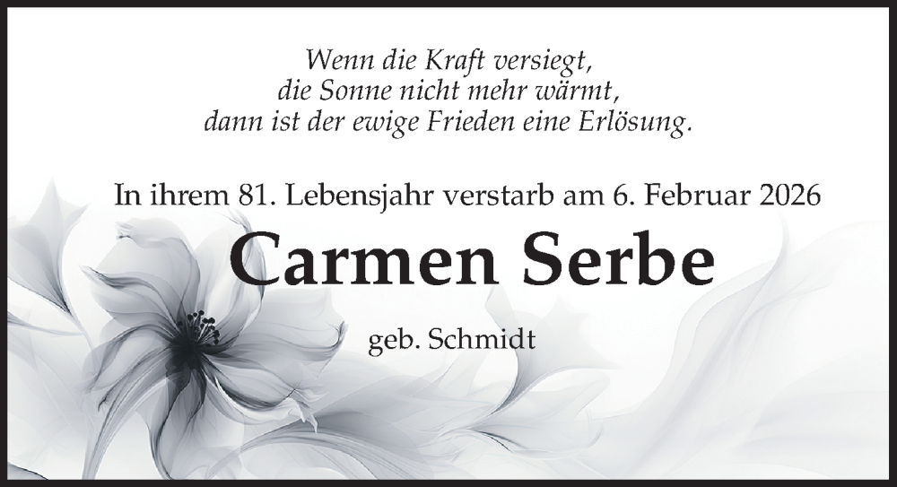 Hier finden Sie alle Traueranzeigen aus der Zeitung, die bisher für Carmen Serbe erschienen sind. Weitere Traueranzeigen, die in der Zeitung erscheinen, werden hier ebenfalls aufgelistet