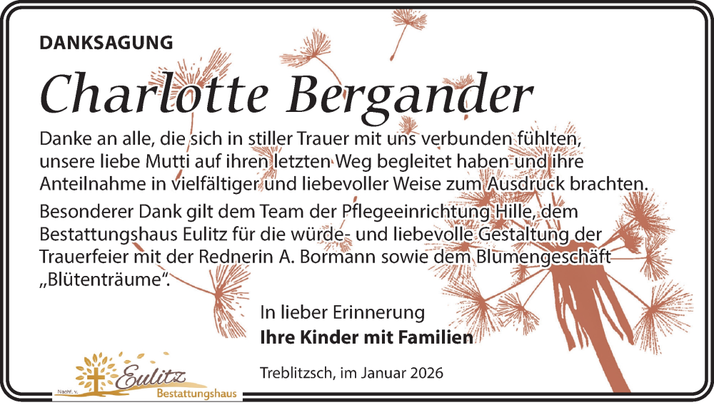 Hier finden Sie alle Traueranzeigen aus der Zeitung, die bisher für Charlotte Bergander erschienen sind. Weitere Traueranzeigen, die in der Zeitung erscheinen, werden hier ebenfalls aufgelistet