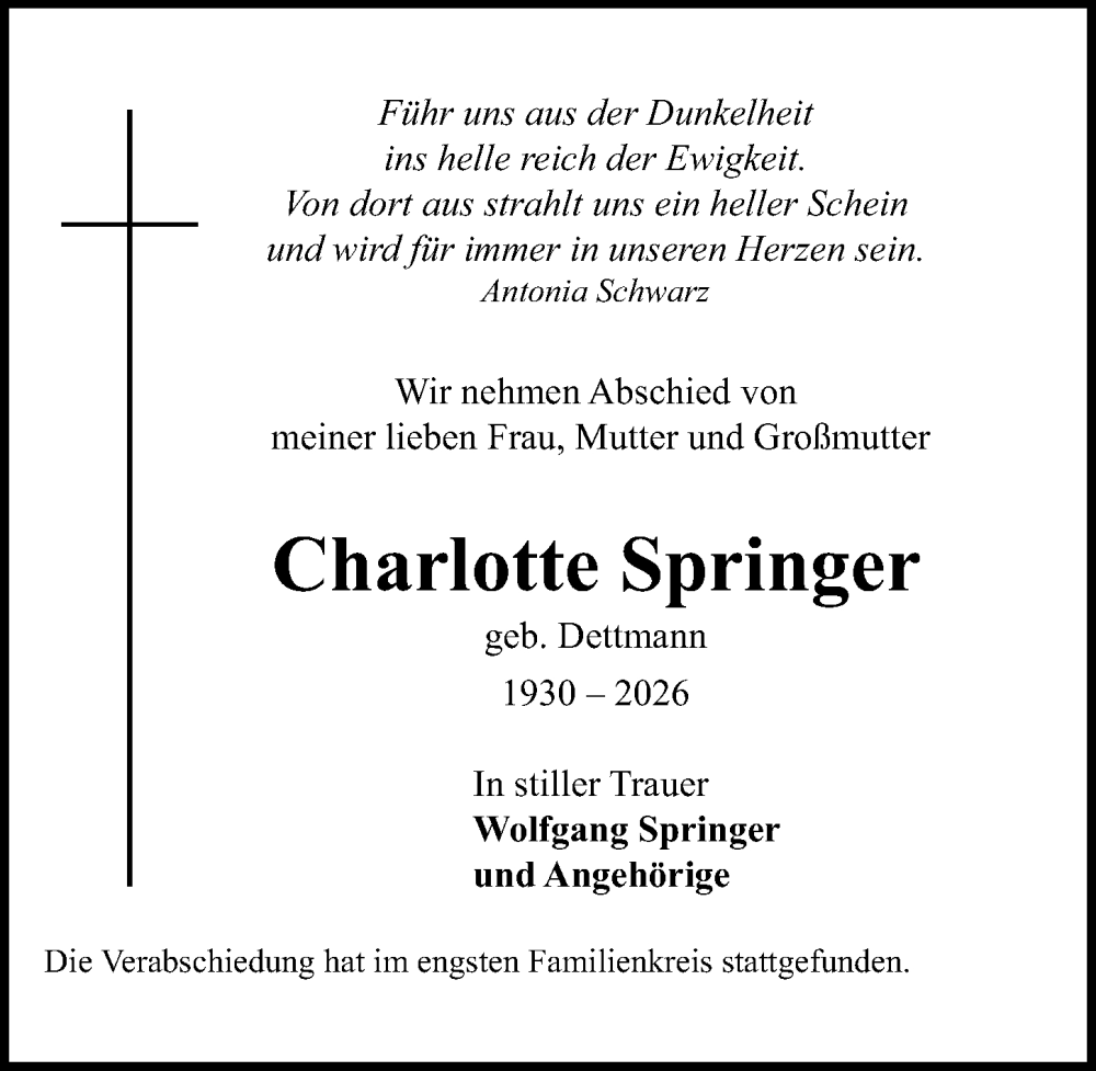 Hier finden Sie alle Traueranzeigen aus der Zeitung, die bisher für Charlotte Springer erschienen sind. Weitere Traueranzeigen, die in der Zeitung erscheinen, werden hier ebenfalls aufgelistet