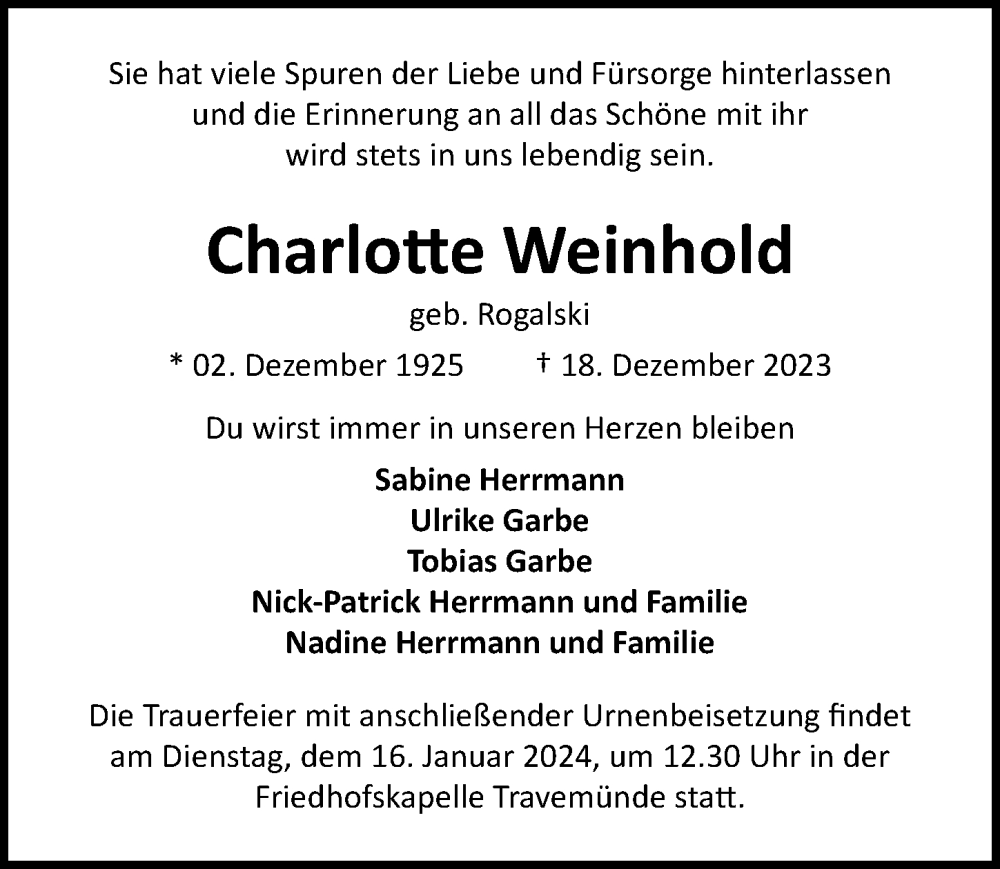 Hier finden Sie alle Traueranzeigen aus der Zeitung, die bisher für Charlotte Weinhold erschienen sind. Weitere Traueranzeigen, die in der Zeitung erscheinen, werden hier ebenfalls aufgelistet