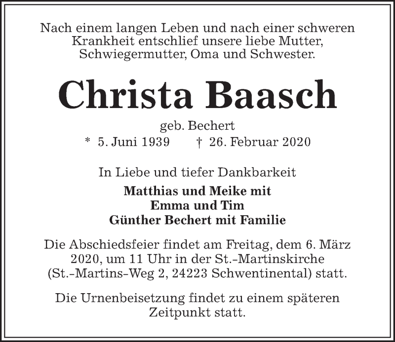 Hier finden Sie alle Traueranzeigen aus der Zeitung, die bisher für Christa Baasch erschienen sind. Weitere Traueranzeigen, die in der Zeitung erscheinen, werden hier ebenfalls aufgelistet