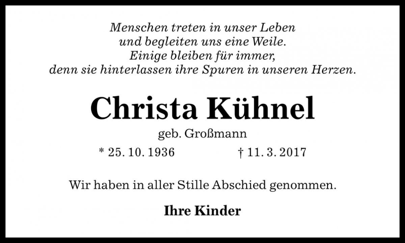 Hier finden Sie alle Traueranzeigen aus der Zeitung, die bisher für Christa Kühnel erschienen sind. Weitere Traueranzeigen, die in der Zeitung erscheinen, werden hier ebenfalls aufgelistet