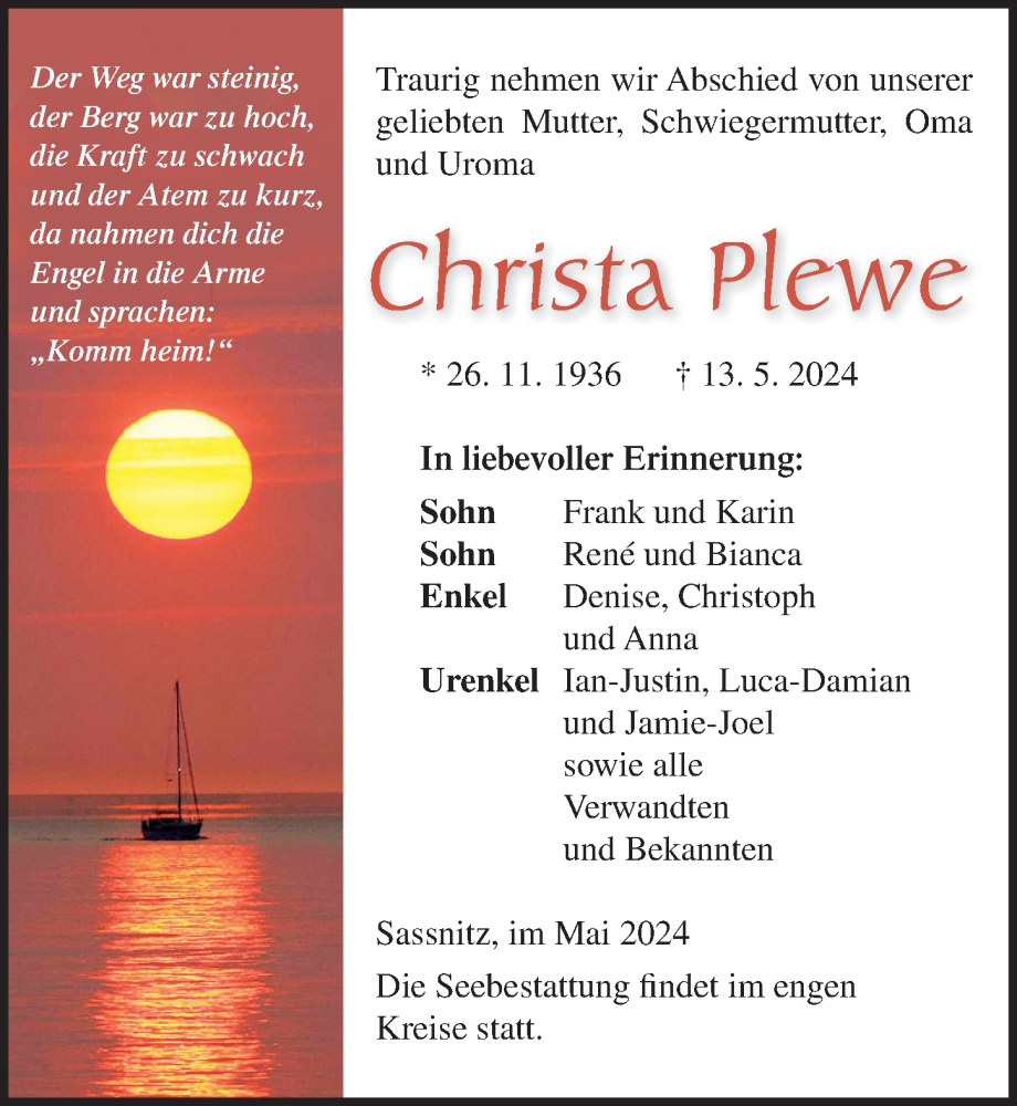 Hier finden Sie alle Traueranzeigen aus der Zeitung, die bisher für Christa Plewe erschienen sind. Weitere Traueranzeigen, die in der Zeitung erscheinen, werden hier ebenfalls aufgelistet
