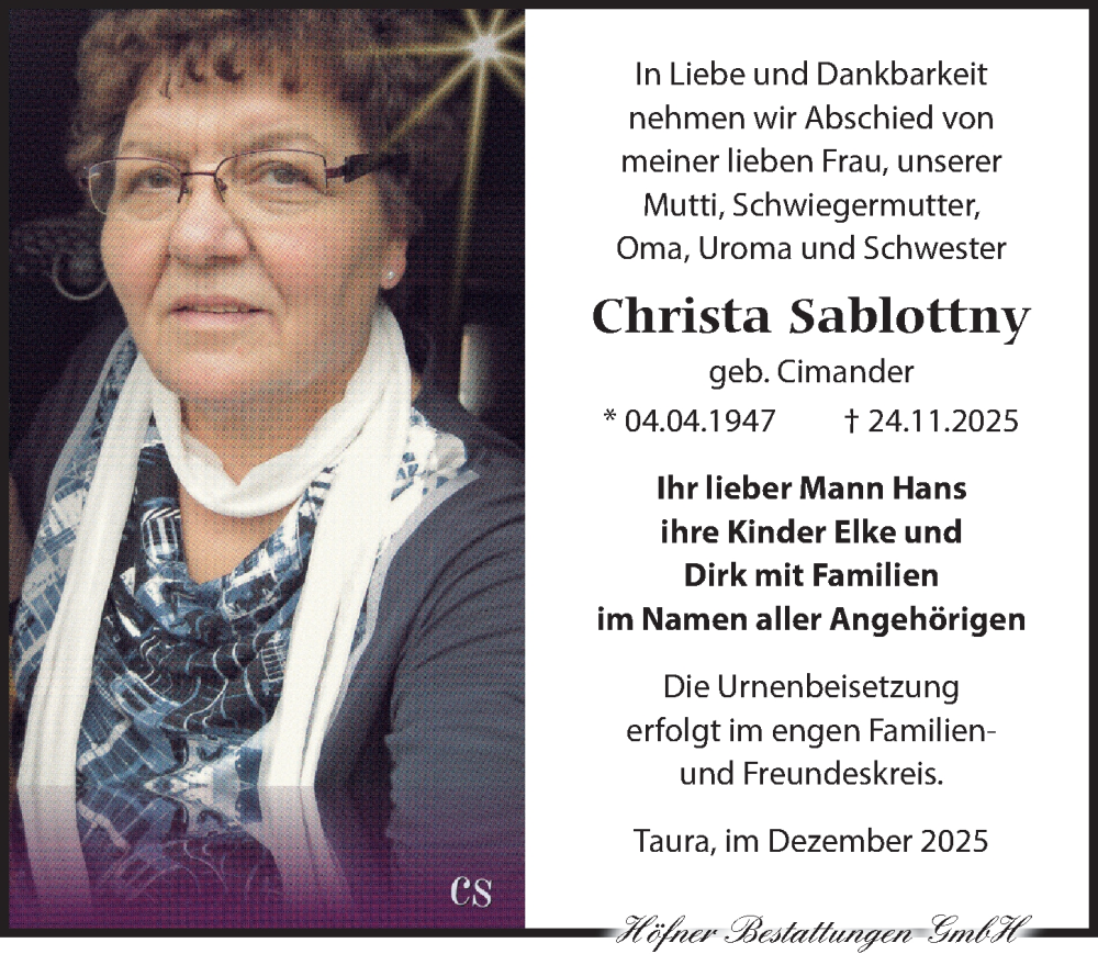 Hier finden Sie alle Traueranzeigen aus der Zeitung, die bisher für Christa Sablottny erschienen sind. Weitere Traueranzeigen, die in der Zeitung erscheinen, werden hier ebenfalls aufgelistet