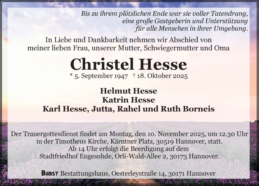 Hier finden Sie alle Traueranzeigen aus der Zeitung, die bisher für Christel Hesse erschienen sind. Weitere Traueranzeigen, die in der Zeitung erscheinen, werden hier ebenfalls aufgelistet
