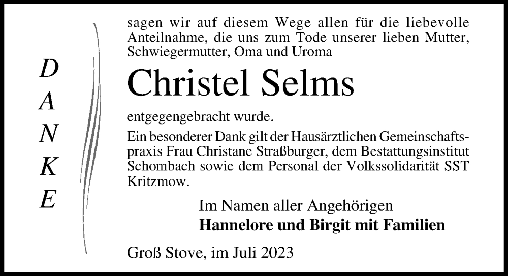 Hier finden Sie alle Traueranzeigen aus der Zeitung, die bisher für Christel Selms erschienen sind. Weitere Traueranzeigen, die in der Zeitung erscheinen, werden hier ebenfalls aufgelistet