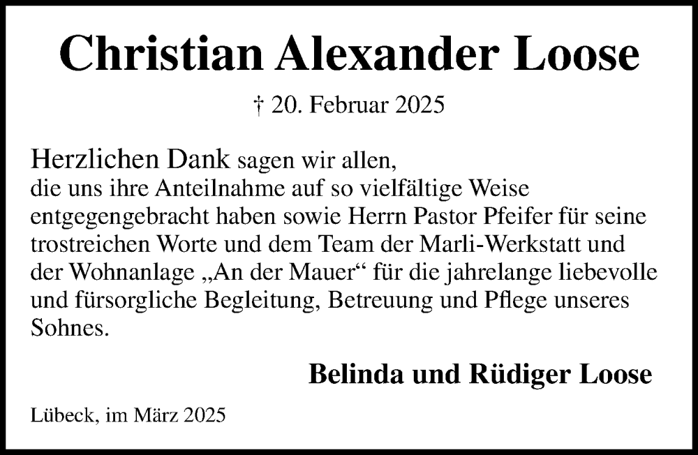 Hier finden Sie alle Traueranzeigen aus der Zeitung, die bisher für Christian Alexander Loose erschienen sind. Weitere Traueranzeigen, die in der Zeitung erscheinen, werden hier ebenfalls aufgelistet