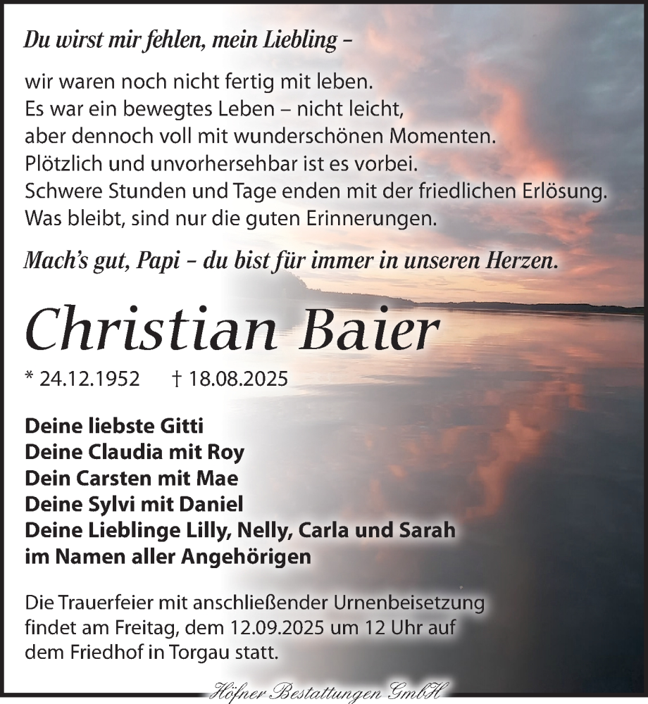 Hier finden Sie alle Traueranzeigen aus der Zeitung, die bisher für Christian Baier erschienen sind. Weitere Traueranzeigen, die in der Zeitung erscheinen, werden hier ebenfalls aufgelistet