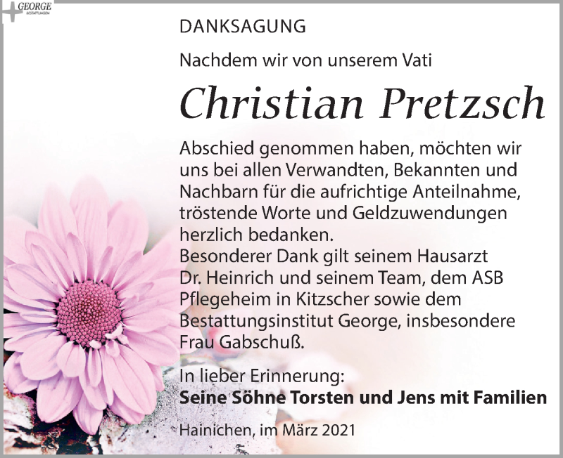 Hier finden Sie alle Traueranzeigen aus der Zeitung, die bisher für Christian Pretzsch erschienen sind. Weitere Traueranzeigen, die in der Zeitung erscheinen, werden hier ebenfalls aufgelistet