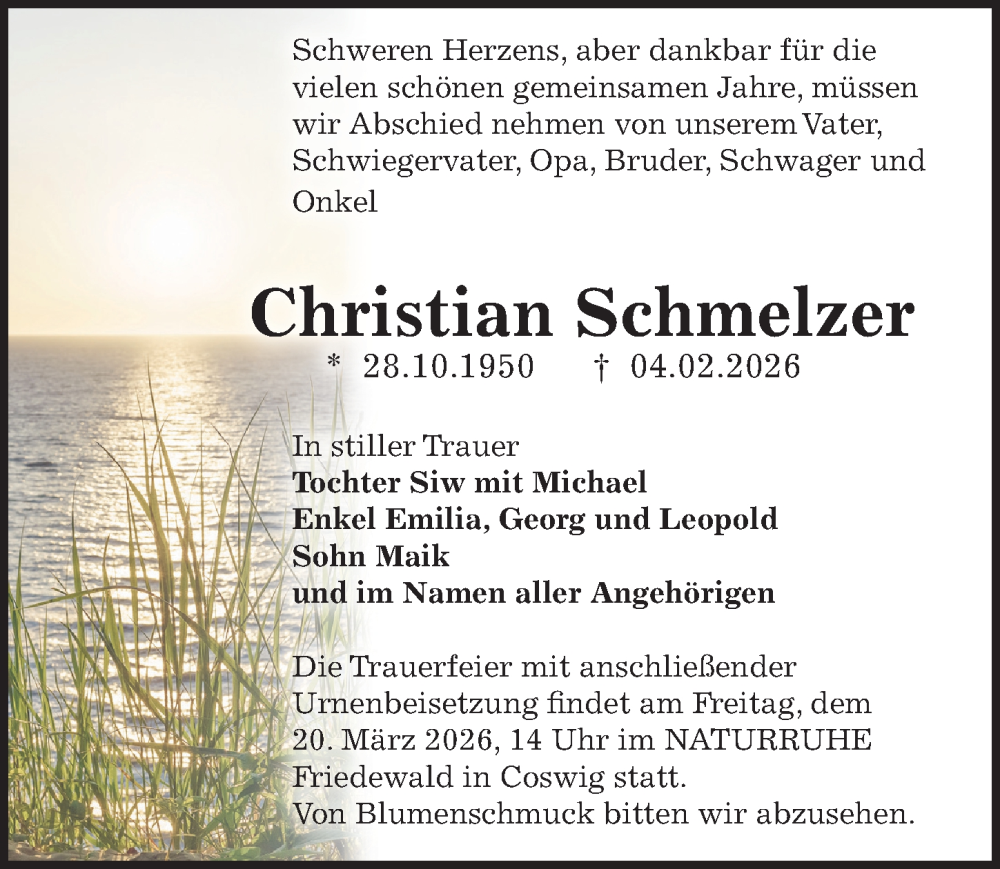 Hier finden Sie alle Traueranzeigen aus der Zeitung, die bisher für Christian Schmelzer erschienen sind. Weitere Traueranzeigen, die in der Zeitung erscheinen, werden hier ebenfalls aufgelistet