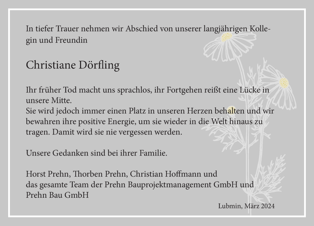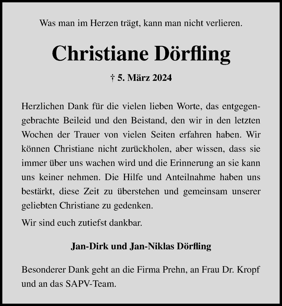 Hier finden Sie alle Traueranzeigen aus der Zeitung, die bisher für Christiane Dörfling erschienen sind. Weitere Traueranzeigen, die in der Zeitung erscheinen, werden hier ebenfalls aufgelistet