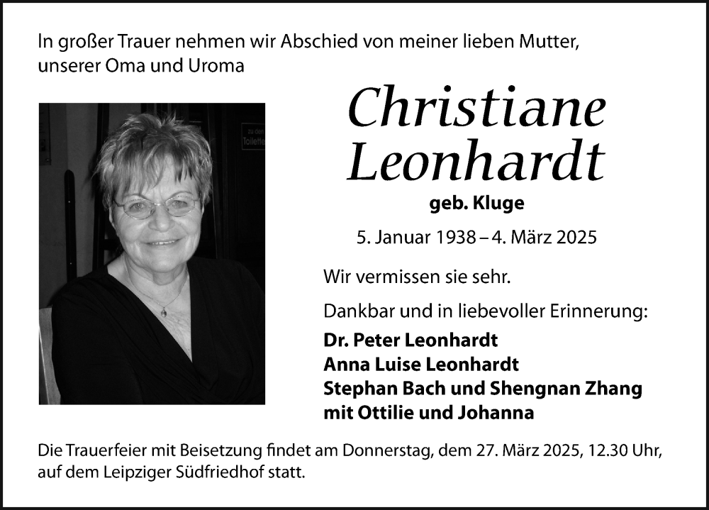 Hier finden Sie alle Traueranzeigen aus der Zeitung, die bisher für Christiane Leonhardt erschienen sind. Weitere Traueranzeigen, die in der Zeitung erscheinen, werden hier ebenfalls aufgelistet
