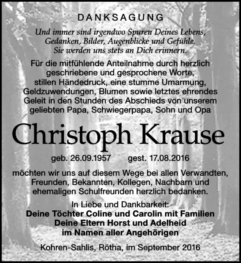 Hier finden Sie alle Traueranzeigen aus der Zeitung, die bisher für Christoph Krause erschienen sind. Weitere Traueranzeigen, die in der Zeitung erscheinen, werden hier ebenfalls aufgelistet