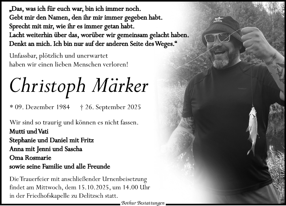 Hier finden Sie alle Traueranzeigen aus der Zeitung, die bisher für Christoph Märker erschienen sind. Weitere Traueranzeigen, die in der Zeitung erscheinen, werden hier ebenfalls aufgelistet