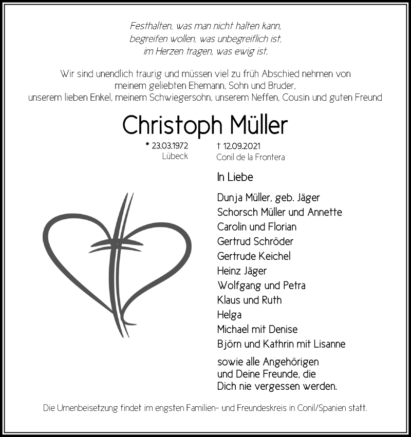 Hier finden Sie alle Traueranzeigen aus der Zeitung, die bisher für Christoph Müller erschienen sind. Weitere Traueranzeigen, die in der Zeitung erscheinen, werden hier ebenfalls aufgelistet