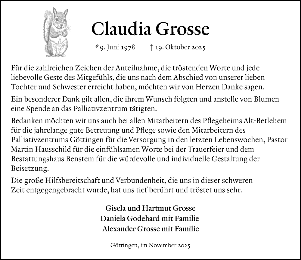 Hier finden Sie alle Traueranzeigen aus der Zeitung, die bisher für Claudia Grosse erschienen sind. Weitere Traueranzeigen, die in der Zeitung erscheinen, werden hier ebenfalls aufgelistet