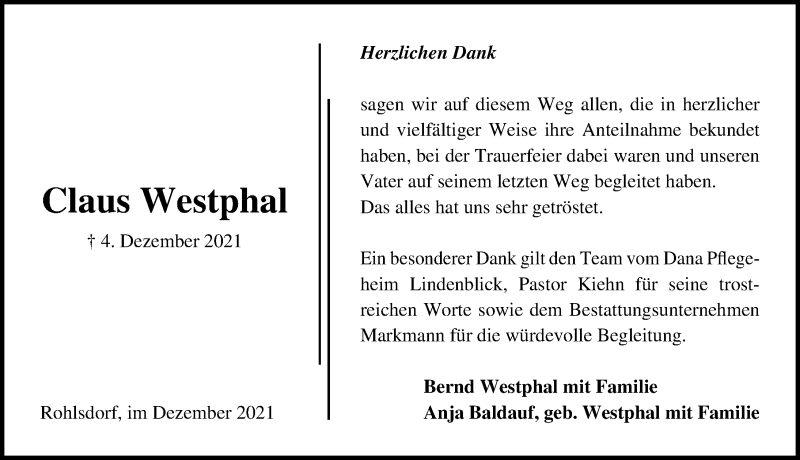 Hier finden Sie alle Traueranzeigen aus der Zeitung, die bisher für Claus Westphal erschienen sind. Weitere Traueranzeigen, die in der Zeitung erscheinen, werden hier ebenfalls aufgelistet
