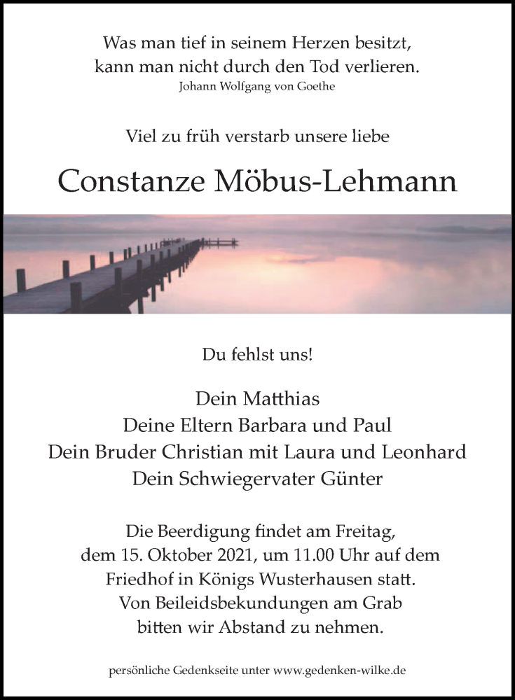 Hier finden Sie alle Traueranzeigen aus der Zeitung, die bisher für Constanze Möbus-Lehmann erschienen sind. Weitere Traueranzeigen, die in der Zeitung erscheinen, werden hier ebenfalls aufgelistet