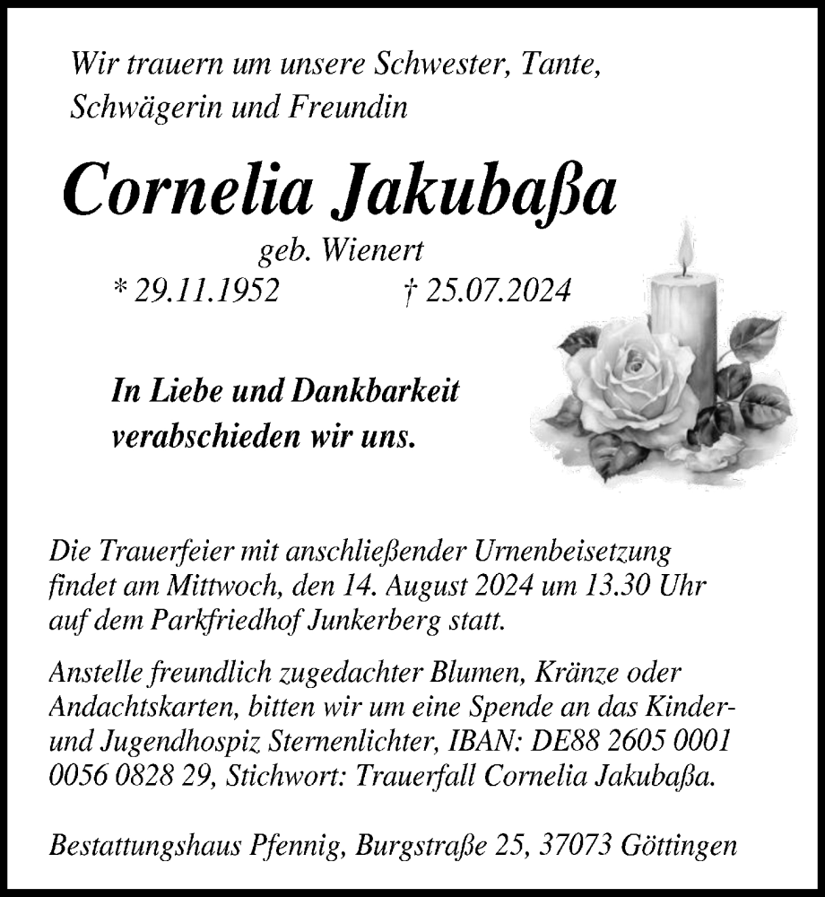Hier finden Sie alle Traueranzeigen aus der Zeitung, die bisher für Cornelia Jakubaßa erschienen sind. Weitere Traueranzeigen, die in der Zeitung erscheinen, werden hier ebenfalls aufgelistet