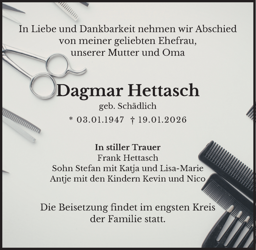 Hier finden Sie alle Traueranzeigen aus der Zeitung, die bisher für Dagmar Hettasch erschienen sind. Weitere Traueranzeigen, die in der Zeitung erscheinen, werden hier ebenfalls aufgelistet