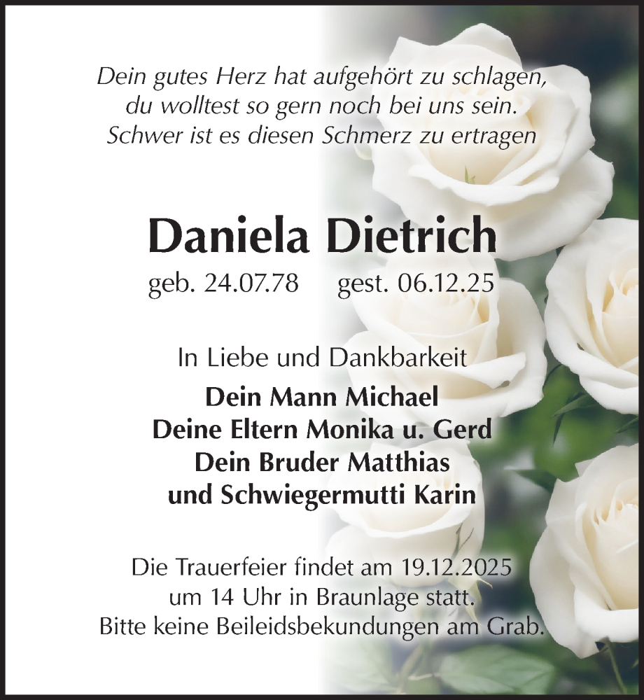 Hier finden Sie alle Traueranzeigen aus der Zeitung, die bisher für Daniela Dietrich erschienen sind. Weitere Traueranzeigen, die in der Zeitung erscheinen, werden hier ebenfalls aufgelistet