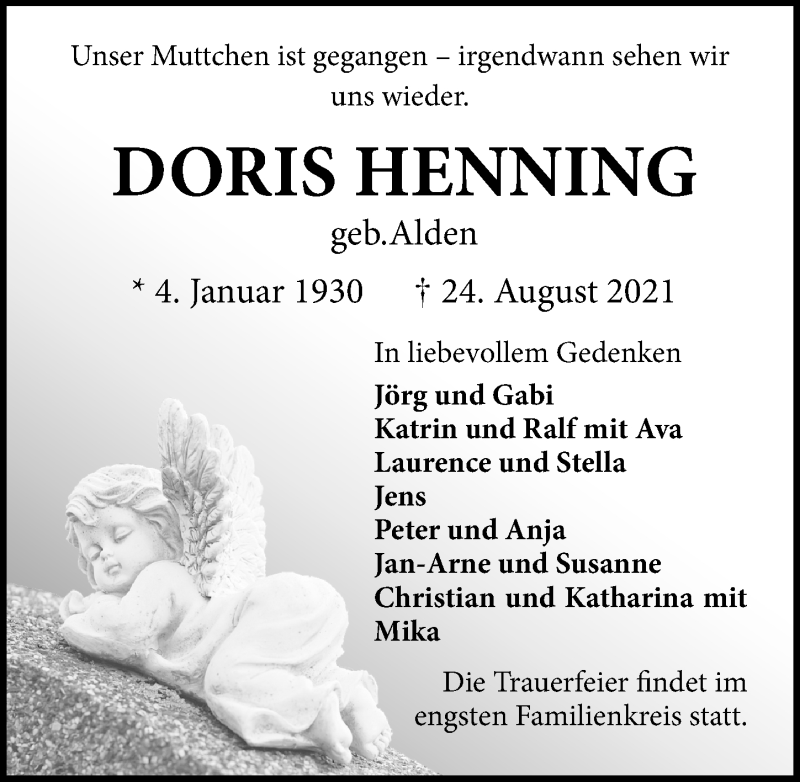 Hier finden Sie alle Traueranzeigen aus der Zeitung, die bisher für Ddoris Henning erschienen sind. Weitere Traueranzeigen, die in der Zeitung erscheinen, werden hier ebenfalls aufgelistet