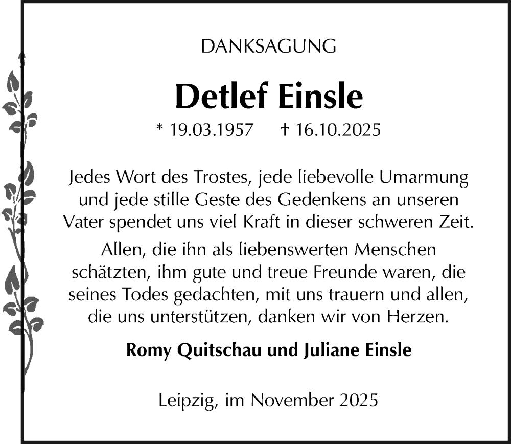 Hier finden Sie alle Traueranzeigen aus der Zeitung, die bisher für Detlef Einsle erschienen sind. Weitere Traueranzeigen, die in der Zeitung erscheinen, werden hier ebenfalls aufgelistet