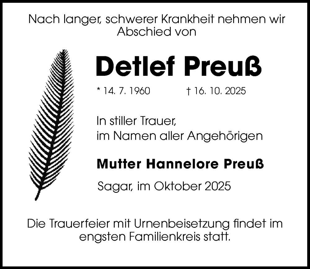 Hier finden Sie alle Traueranzeigen aus der Zeitung, die bisher für Detlef Preuß erschienen sind. Weitere Traueranzeigen, die in der Zeitung erscheinen, werden hier ebenfalls aufgelistet