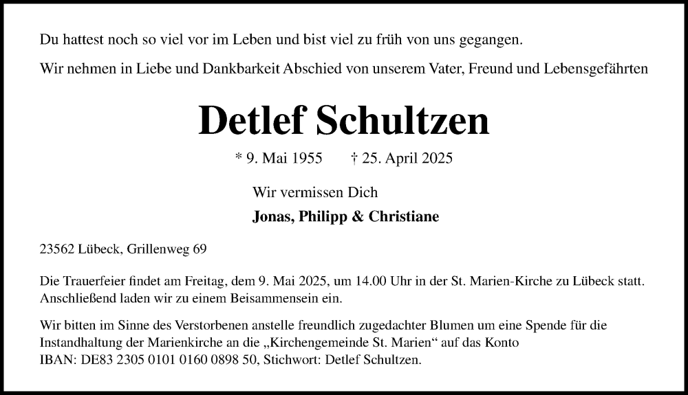 Hier finden Sie alle Traueranzeigen aus der Zeitung, die bisher für Detlef Schultzen erschienen sind. Weitere Traueranzeigen, die in der Zeitung erscheinen, werden hier ebenfalls aufgelistet