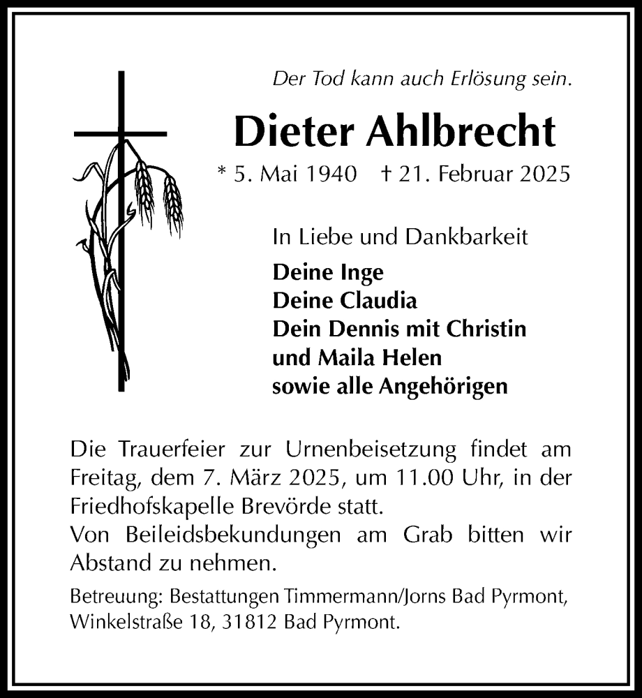 Hier finden Sie alle Traueranzeigen aus der Zeitung, die bisher für Dieter Ahlbrecht erschienen sind. Weitere Traueranzeigen, die in der Zeitung erscheinen, werden hier ebenfalls aufgelistet
