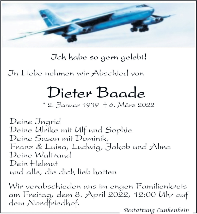 Hier finden Sie alle Traueranzeigen aus der Zeitung, die bisher für Dieter Baade erschienen sind. Weitere Traueranzeigen, die in der Zeitung erscheinen, werden hier ebenfalls aufgelistet