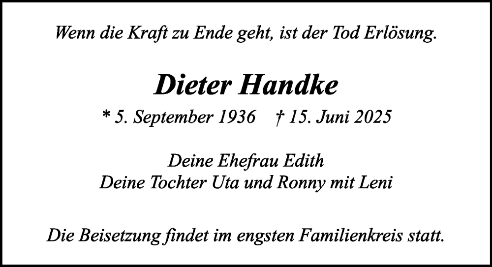 Hier finden Sie alle Traueranzeigen aus der Zeitung, die bisher für Dieter Handke erschienen sind. Weitere Traueranzeigen, die in der Zeitung erscheinen, werden hier ebenfalls aufgelistet